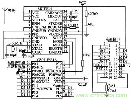 主控制器電路原理如圖3所示。主控制器模塊采用穩(wěn)定、可靠的微控制器C8051F531A,其內(nèi)置振蕩電路和增強(qiáng)型的SPI接口,外擴(kuò)SPI無線接收芯片MC33594和操作簡單、方便的并行液晶模塊。
