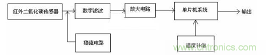 檢測電路由紅外二氧化碳傳感器、數(shù)字濾波電路、放大電路、穩(wěn)流電路、單片機(jī)系統(tǒng)、溫度補(bǔ)償?shù)冉M成?;驹硎羌t外二氧化碳傳感器將檢測到的二氧化碳?xì)怏w濃度轉(zhuǎn)換成相應(yīng)的電信號,輸出的電信號分別經(jīng)過濾波、放大處理,輸入到單片機(jī)系統(tǒng),并經(jīng)溫度和氣壓補(bǔ)償?shù)忍幚砗?,由單片機(jī)系統(tǒng)輸出送顯示裝置顯示其測量值。