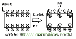 當(dāng)一些晶體受熱時,在晶體兩端將會產(chǎn)生數(shù)量相等而符號相反的電荷,這種由于熱變化產(chǎn)生的電極化現(xiàn)象,被稱為熱釋電效應(yīng)。通常,晶體自發(fā)極化所產(chǎn)生的束縛電荷被來自空氣中附著在晶體表面的自由電子所中和,其自發(fā)極化電矩不能表現(xiàn)出來。當(dāng)溫度變化時,晶體結(jié)構(gòu)中的正負(fù)電荷重心相對移位,自發(fā)極化發(fā)生變化,晶體表面就會產(chǎn)生電荷耗盡,電荷耗盡的狀況正比于極化程度,圖1表示了熱釋電效應(yīng)形成的原理。
