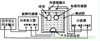 采用間接比較法測(cè)量傳感器的靈敏度,在聲場(chǎng)均勻的油腔內(nèi),距發(fā)射源相同距離處放置標(biāo)準(zhǔn)傳感器和被測(cè)傳感器,兩傳感器同時(shí)接收換能器發(fā)射的聲波信號(hào),用示波器分別測(cè)量2只傳感器的輸出峰值電壓V標(biāo)和V測(cè),得到V標(biāo)/V測(cè)=M標(biāo)/M測(cè),即