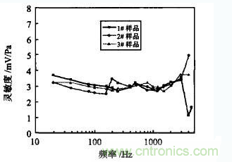 樣品采用北京信息工程學(xué)院研制的YLC-A型壓電式微壓傳感器,樣品數(shù)為3只。將傳感器安裝在測(cè)試腔蓋樣品架上,輸出端與腔蓋上的樣品輸出引線連接,扣緊腔蓋,按圖1所示連接系統(tǒng)。由于傳感器內(nèi)裝前置放大器,需提供直流電源工作,電源加在腔蓋上被測(cè)傳感器輸出端。調(diào)節(jié)信號(hào)發(fā)生器產(chǎn)生正弦信號(hào),信號(hào)幅度不宜過(guò)大,以避免傳感器輸出失真。取多個(gè)信號(hào)頻率,分別測(cè)量每個(gè)頻率點(diǎn)兩傳感器的輸出電壓,在1kHz處示波器上的標(biāo)準(zhǔn)傳感器波形(1)的峰-峰值電壓為145.5mV;被測(cè)傳感器波形(2)的峰峰值電壓為5.85V。將V標(biāo)和V測(cè)代入式(1)算出被測(cè)傳感器的靈敏度。根據(jù)計(jì)算結(jié)果繪制傳感器的靈敏度隨頻率變化曲線,如圖2所示,得到傳感器的頻率響應(yīng)范圍。