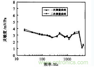 為檢測(cè)測(cè)量系統(tǒng)的重復(fù)性,實(shí)驗(yàn)對(duì)1#傳感器進(jìn)行了重復(fù)測(cè)量,圖3示出2次測(cè)量的靈敏度變化曲線。