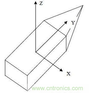 在本系統(tǒng)中,三軸加速度計(jì)和三軸MR傳感器都以以下的方式安裝于電路板上:它們的X軸平行于系統(tǒng)的橫軸指向右,Y軸平行于系統(tǒng)的縱軸指向前,X、Y、Z軸定義為右手坐標(biāo)系統(tǒng),如圖2所示。