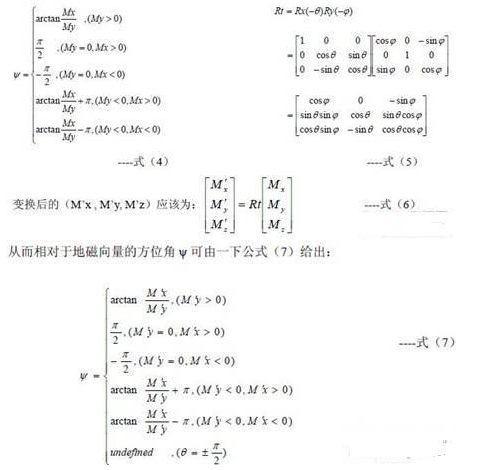 為了獲得系統(tǒng)相對(duì)于當(dāng)?shù)氐卮畔蛄康姆轿唤牵枰褂肕R傳感器的三個(gè)輸出Mx, My, Mz.當(dāng)系統(tǒng)置于水平狀態(tài)時(shí)(俯仰角和橫滾角都為0)時(shí),方位角ψ可以由公式(4)直接給出,但是在大多數(shù)情況下,系統(tǒng)并不是工作在水平狀態(tài),此時(shí)地磁場(chǎng)的豎直分量將會(huì)影響Mx和My的值,因此不能直接由公式(4)獲得相對(duì)于地磁向量的方位角。為了在所有情況下都能獲得正確的方位角,必須將俯仰角和橫滾角考慮在內(nèi),即必須通過以俯仰角和橫滾角為參數(shù)的坐標(biāo)變換,將測(cè)得的(Mx, My, Mz)向量變換為與載體坐標(biāo)系有相同方位角的水平坐標(biāo)系下的向量(M‘x , M’y, M‘z),其變換矩陣如公式(5)。