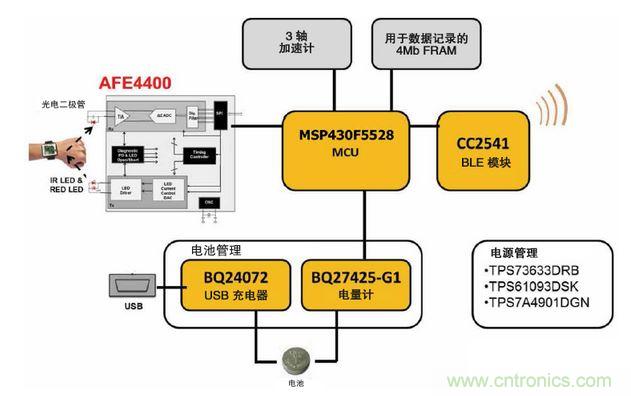 圖4中就是這樣一個TIDesign (TIDA-00011),其中展示了一個典型的光學(xué)、佩帶在手腕上的心率系統(tǒng)應(yīng)用。這個手腕佩帶式心率監(jiān)視器參考設(shè)計說明了TI技術(shù)是如何組合在一起來提供完整解決方案的。使用一個LED到光電二極管光信號的轉(zhuǎn)換,TI的AFE4400($3.3188)感測由佩帶者脈搏跳動所引起的皮膚表面變化,然后將模擬信號放大并轉(zhuǎn)換為數(shù)字信號,然后再將此數(shù)字信號傳遞給MSP430($2.0250) MCU?;赥I SimpleLinkTM Bluetooth低能耗CC2541($2.3625)無線MCU的模塊提供到智能手機(jī)或其他本地系統(tǒng)的無線連接。非易失性鐵電隨機(jī)存儲器提供數(shù)據(jù)記錄功能,而加速計感測身體運(yùn)動。此參考設(shè)計還包括管理電池電量和不同系統(tǒng)功能的器件。希望設(shè)計此類終端設(shè)備的開發(fā)人員可以從TI直接訪問所有內(nèi)容,原樣搭建這一系統(tǒng),并且立即運(yùn)行。在這里,要定制解決方案,開發(fā)人員只需添加其自己的知識產(chǎn)權(quán)即可。