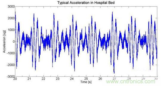 在最近的一項(xiàng)項(xiàng)目設(shè)計(jì)中,村田的工程師們分析了病人在病床上的活動(dòng),并分離出了心搏圖數(shù)據(jù),心搏圖數(shù)據(jù)如圖3,從中可以看到床的諧振影響到信號(hào),且隨時(shí)間衰減。而可靠的測(cè)量信號(hào)在10mg范圍,這需要加速度傳感器的分辨率特別的高,適合此應(yīng)用的傳感器之一是村田的SCA61T,其噪聲密度大約是14μg/√Hz。
