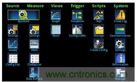 吉時(shí)利2450型交互式數(shù)字源表SMU儀器簡(jiǎn)化了非傳統(tǒng)用戶的學(xué)習(xí)曲線,使之從使用多層菜單結(jié)構(gòu)和多功能按鈕配置功能的繁瑣工作中解脫出來(lái)。2450型儀器使用基于圖標(biāo)的平面菜單系統(tǒng),就像在智能消費(fèi)電子產(chǎn)品中使用的菜單系統(tǒng)一樣簡(jiǎn)單,如平板電腦或智能手機(jī)上顯示的應(yīng)用圖標(biāo)排列。