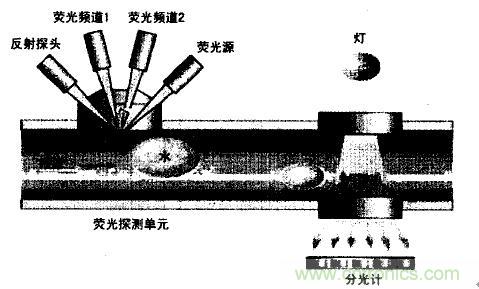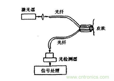 發(fā)光頻率為f的激光經(jīng)透鏡,光纖被送到表皮組織。對于不動的組織,例如血管壁,所反射的光不產(chǎn)生頻移;而對于皮層毛細(xì)血管里流速為 的紅細(xì)胞,反射光要產(chǎn)生頻移,其頻率變化為△f;發(fā)生頻移的反射光強(qiáng)度與紅細(xì)胞的濃度成比例,頻率的變化值可與紅細(xì)胞的運(yùn)動速度成正比。發(fā)射光經(jīng)光纖收集后,先在光檢測器上進(jìn)行混頻,然后進(jìn)人信號處理儀,從而得到紅細(xì)胞的運(yùn)動速度和濃度。