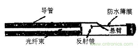 1、壓力測量。目前臨床上應(yīng)用的壓力傳感器主要用來測量血管內(nèi)的血壓、顱內(nèi)壓、心內(nèi)壓、膀胱和尿道壓力等。用來測量血壓的壓力傳感器示意見圖3。其中對壓力敏感的部分是在探針導(dǎo)管末端側(cè)壁上的一塊防水薄膜,一面帶有懸臂的微型反射鏡與薄膜相連,反射鏡對面是一束光纖,用來傳遞入射光到反射鏡,同時也將反射光傳送出來。當(dāng)薄膜上有壓力作用時。薄膜發(fā)生形變且能帶動懸臂使反射鏡角度發(fā)生改變,從光纖傳來的光束照射到反光鏡上,再反射到光纖的端點(diǎn)。由于反射光的方向隨反射鏡角度的變化而改變,因此光纖接收到的反射光的強(qiáng)度也隨之變化。這一變化通過光纖傳到另一端的光電探測器變成電信號,這樣通過電壓的變化便可知探針處的壓力大小。