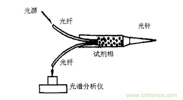 用來測定活體組織和血液值pH光纖光譜傳感器示意圖,如圖5所示。其工作原理是利用發(fā)射光、透射光的強(qiáng)度隨波長的分布光譜來進(jìn)行測量。這種傳感器將兩根光纖插入可透過離子的纖維素膜盒中.膜盒內(nèi)裝有試劑,當(dāng)把針頭插入組織或血管后,體液滲入試劑,導(dǎo)致試劑吸收某種波長的光。用光譜分析儀測出此種變化,即可求得血液或組織的pH值。