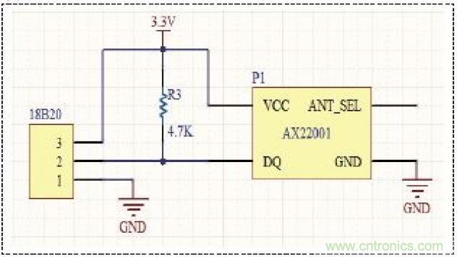 溫度采集單元主要有傳感器、處理器和電源組成,傳感器18B20負(fù)責(zé)區(qū)域內(nèi)溫度信息的采集和數(shù)據(jù)轉(zhuǎn)換,將溫度的傳感器信息經(jīng)過(guò)A/D轉(zhuǎn)換,得到數(shù)字信息,供處理器AX22001進(jìn)行處理。其原理圖如圖1所示,其中ANT_SEL引腳接天線,用來(lái)傳送無(wú)線信號(hào)。