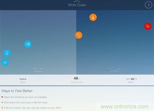 測(cè)試人員發(fā)現(xiàn),CubeSensors給出的這些信息較想象中更為有用。例如,產(chǎn)品提示一處起居室的溫度有點(diǎn)低,如果適當(dāng)提升溫度會(huì)讓人感覺(jué)更加舒適及放松。而在辦公室中,CubeSensors提示改善光照條件能夠幫助提升工作效率。在臥室中,產(chǎn)品給出了需要開(kāi)窗以便改善空氣質(zhì)量的建議。用戶(hù)除了查看數(shù)據(jù)之外,還能看到應(yīng)用給出的實(shí)用建議,例如“盡快開(kāi)窗”或“提升溫度會(huì)讓你感覺(jué)更加舒適”。盡管看起來(lái)似乎平淡無(wú)奇,但CubeSensors背后的團(tuán)隊(duì)表示,通過(guò)這些小建議,產(chǎn)品可以幫助用戶(hù)避免罹患感冒、過(guò)敏、頭疼等癥狀。