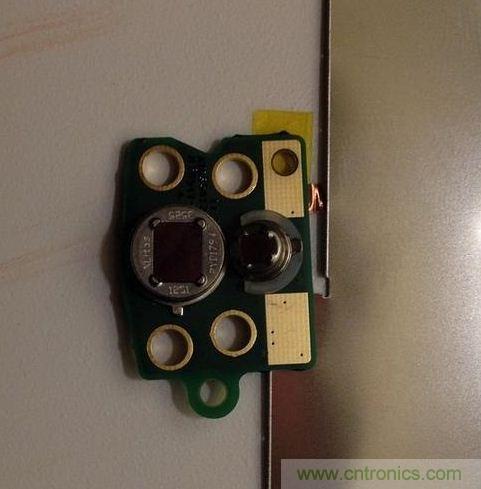 用戶可以旋轉(zhuǎn)Nest恒溫器的外圈來(lái)選擇選項(xiàng)。這個(gè)光電鼠標(biāo)上的發(fā)射器/傳感器組合就是用來(lái)檢測(cè)旋轉(zhuǎn)的器件。外圈內(nèi)部可以看到光學(xué)鼠標(biāo)元件用來(lái)檢測(cè)旋轉(zhuǎn)的溝槽圖案。