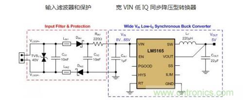 圖 2:脈沖頻率調(diào)制 (PFM) 同步降壓型轉(zhuǎn)換器原理圖,包括一個(gè) EMC 濾波器和保護(hù)電路