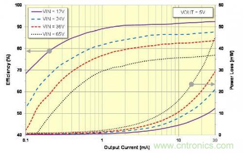 LM5165 中內(nèi)置的面向智能傳感器應(yīng)用的各種特性包括一種用于實(shí)現(xiàn)最佳解決方案尺寸的簡單控制架構(gòu)、用于提供低壓差的 100% 占空比能力、一個(gè)用于電源軌排序和故障報(bào)告的漏極開路電源良好指示電路、在內(nèi)部固定或從外部可調(diào)的軟起動(dòng) (SS)、以及具有可定制遲滯以提供可編程線路欠壓閉鎖 (UVLO) 功能的高精度啟用。而且,一種可調(diào)的逐周期電流限制優(yōu)化了電感器選擇和尺寸。圖 3 顯示出了對于 0.1mA 至 30mA 負(fù)載電流的轉(zhuǎn)換器效率和功率耗散。
