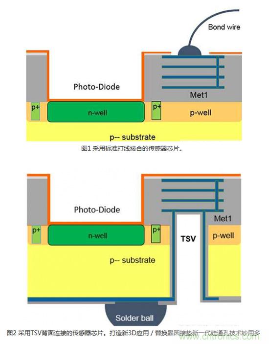 模擬3DIC技術(shù)通常是透過建造芯片正面到IC背面的電氣連接來實(shí)現(xiàn)傳感器應(yīng)用。 在許多傳感器應(yīng)用,例如光學(xué)、化學(xué)、氣體或壓力傳感器中,感測區(qū)域是位在CMOS側(cè)(晶圓的頂端)。 芯片和導(dǎo)線架之間最常用的連接是打線接合(Wire bonding)(圖1)。 無論是使用塑料封裝,或是將裸片直接接合在印刷電路(PCB)或軟性電路板上,對于某些會將感測區(qū)域暴露出來的應(yīng)用而言,打線接合并非理想的解決方案。 采用專業(yè)晶圓代工業(yè)者的專有TSV技術(shù),可以利用TSV、背面RDL和芯片級封裝(WLCSP)(圖2)來替代打線。