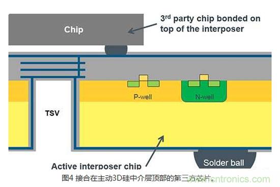 3DIC技術(shù)的另一個(gè)變化和極為創(chuàng)新的發(fā)展,是硅中介層架構(gòu)(Silicon interposer architecture)。 所謂的被動3D硅中介層是用來產(chǎn)生一個(gè)從芯片的頂端到底部的簡單電氣連接。 所謂的主動3D硅中介層能支持實(shí)現(xiàn)完整CMOS設(shè)計(jì)所需制程技術(shù)的所有被動和主動組件。