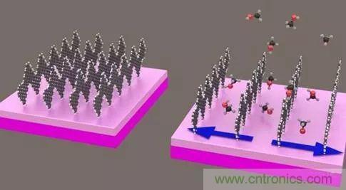 這張圖片呈現(xiàn)了氣體分子如何擴(kuò)大團(tuán)隊(duì)石墨烯納米帶行與行之間的間隙。內(nèi)布拉斯加州材料與納米科學(xué)中心的AlexanderSinitskii及其同事已經(jīng)提出這種現(xiàn)象部分地解釋了納米帶如何為傳感器提供前所未有的靈敏度Sinitskii和他的同事懷疑納米帶的顯著性能部分來源于納米帶和氣體分子之間非同尋常的相互作用。不同于他們的前輩,該團(tuán)隊(duì)的納米帶排列整齊,類似于查理布朗的條紋襯衫般垂直放置,而不是平躺在表面。該團(tuán)隊(duì)指出,氣體分子可以將這些行列分開,有效地延長(zhǎng)了納米帶之間的間隙,幫助電子跳躍到導(dǎo)電區(qū)。加入(苯)環(huán)