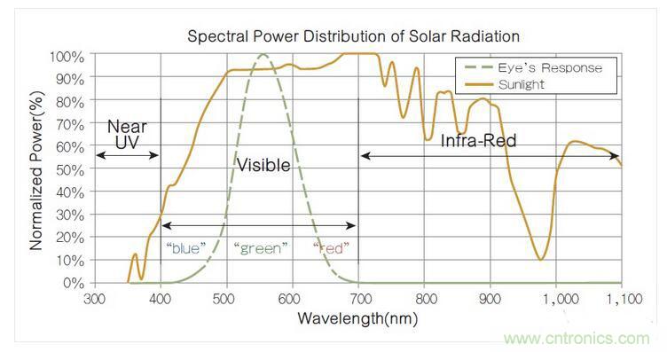 圖1 太陽(yáng)光的光譜功率分布,其中的強(qiáng)功率紅外線成分對(duì)人眼而言是不可見(jiàn)的。