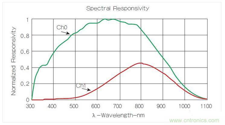 艾邁斯半導(dǎo)體已針對(duì)這個(gè)問(wèn)題提出一個(gè)更好的解決方案:雙二極管(dual-diode)模塊。其中一個(gè)光電二極管(如圖2中所示的Channel 0)用來(lái)感測(cè)全光譜,另一個(gè)(圖中的Channel 1)則主要用來(lái)感測(cè)光譜中的紅外線部分。從全光譜傳感器的輸出中減掉紅外線光電二極管的輸出,則可得到可見(jiàn)光的測(cè)量結(jié)果。