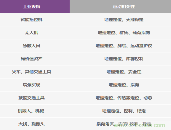 多數(shù)情況下,物聯(lián)網(wǎng)都處于運(yùn)動(dòng)狀態(tài)。即使不處于運(yùn)動(dòng)狀態(tài)——比如,靜止的工業(yè)安全攝像頭——精密指向仍可能必不可少,或者,關(guān)于無(wú)用運(yùn)動(dòng)(篡改)的知識(shí)也可能非常有價(jià)值。如果能在惡劣的飛行條件下維持精確的指向角度,用光學(xué)載荷捕捉作物圖像的無(wú)人機(jī)就有可能更快地帶來(lái)更好的結(jié)果;如果能為光學(xué)數(shù)據(jù)提供準(zhǔn)確的地理測(cè)繪信息,則有可能實(shí)現(xiàn)對(duì)數(shù)據(jù)和趨勢(shì)的歷史比較。智能交通工具,無(wú)論是地面交通工具,還是空中或海上交通工具,它們都越來(lái)越依賴(lài)GPS導(dǎo)航。然而,GPS遭受的精度壓力也越來(lái)越大,無(wú)論是有意為之,還是自然使然(建筑物、樹(shù)木、隧道等)。如果選擇時(shí)考慮了精度需求,則額外的傳感器仍然可以在事故中斷期間可靠地進(jìn)行航向角推算。表2列出了使IoMT(運(yùn)動(dòng)物聯(lián)網(wǎng))中的M(運(yùn)動(dòng))概念名符其實(shí)的一些因素,注意運(yùn)動(dòng)與通用應(yīng)用之間的關(guān)系。