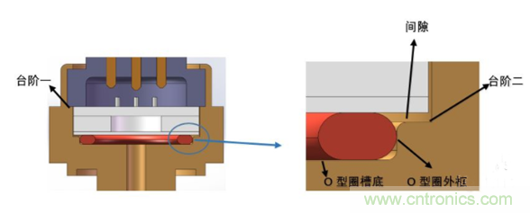 通過控制上圖中臺階一與O型圈槽底的高度差,對O型圈壓縮量進(jìn)行控制。