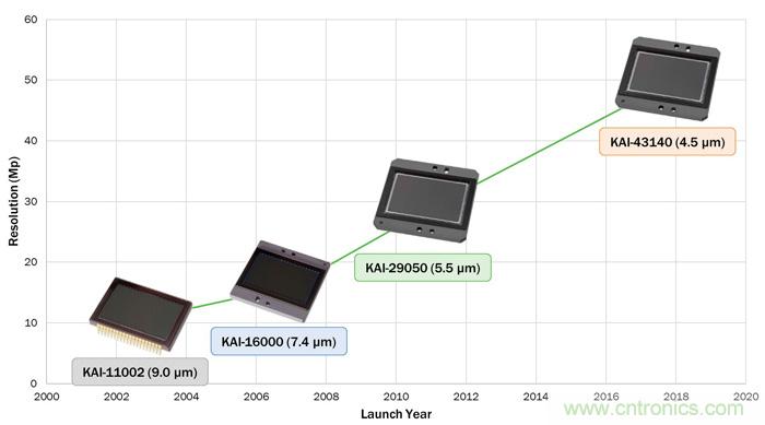 Interline Transfer CCD技術(shù)用于開發(fā)高分辨率、大格式圖像傳感器已超過15年,其分辨率隨市場(chǎng)需要逐漸提高。例如,2003年的KAI-11000圖像傳感器以35 mm光學(xué)格式提供1100萬像素的分辨率;但到2011年,這種相同的光學(xué)格式幾乎可支持三倍的分辨率。
