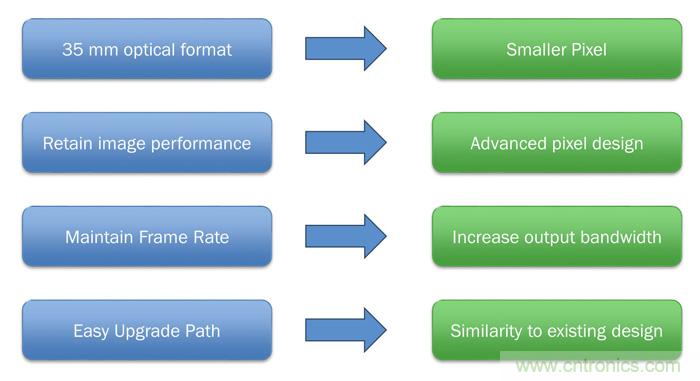 為了在保留35 mm光學(xué)格式的同時(shí),將器件(例如KAI-29050)的分辨率從現(xiàn)有的2900萬像素繼續(xù)提升,就需要更小的像素格式,以便將更多像素放置于給定區(qū)域中。但為同時(shí)保留這一較小像素中的關(guān)鍵成像參數(shù),如圖像均勻性、動(dòng)態(tài)范圍和底噪,除了簡(jiǎn)單地縮小尺寸外,還需要提升像素設(shè)計(jì)。