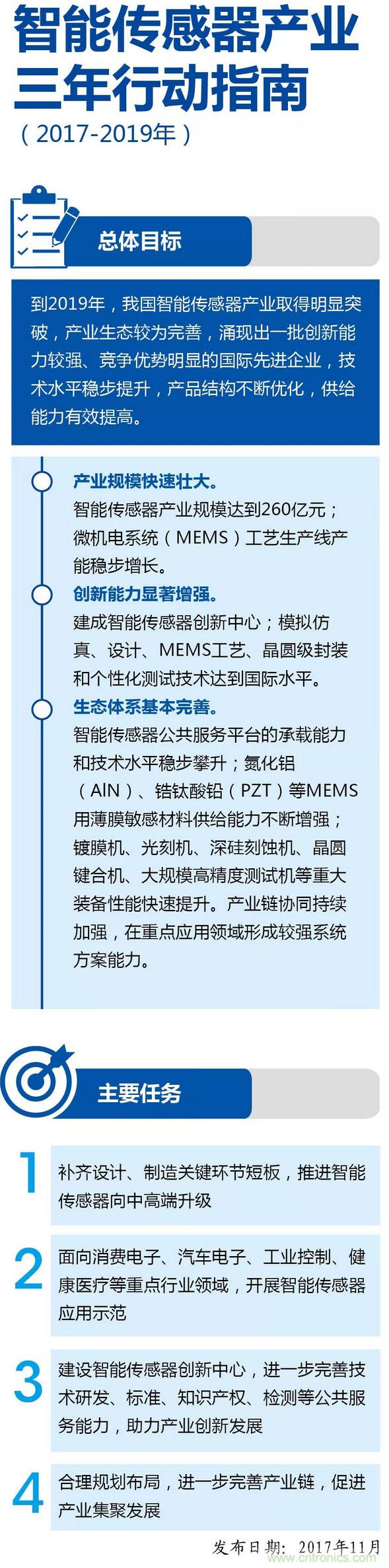 2017年,工信部發(fā)布了《智能傳感器產(chǎn)業(yè)三年行動指南(2017-2019年)》,提出了要在智能終端、物聯(lián)網(wǎng)、汽車電子等工業(yè)領(lǐng)域有所發(fā)展。據(jù)有關(guān)專家預(yù)計2019年中國的智能傳感器產(chǎn)值將達到35億美元,國產(chǎn)智能傳感器所占比重將達到25%以上,比之前比重提高一倍。