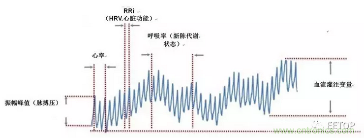 光學(xué)心率傳感器可生成測(cè)量心率的PPG波形并將該心率數(shù)據(jù)作為基礎(chǔ)生物計(jì)量值,但是利用PPG波形可以測(cè)量的對(duì)象遠(yuǎn)不止于此。盡管很難取得和維護(hù)精確的PPG測(cè)量結(jié)果(我們將在下一篇詳細(xì)論述它),但是如果您能夠成功獲得精確的PPG測(cè)量結(jié)果,它將發(fā)揮強(qiáng)大的作用。高品質(zhì)PPG信號(hào)是當(dāng)今市場(chǎng)需求的大量生物計(jì)量的基礎(chǔ)。圖2是經(jīng)過簡化的PPG信號(hào),該信號(hào)代表了多個(gè)生物計(jì)量的測(cè)量結(jié)果。