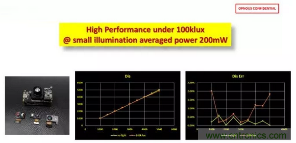 炬佑智能在ToF感知功能方面做了大量的開發(fā),劉洋先生在現(xiàn)場為大家展示了炬佑智能開發(fā)的3D ToF傳感芯片和模組的測試結果。經過炬佑智能自己研發(fā)的智能算法校正后,ToF傳感器在不同背景光的反射率誤差從6%下降到1.4%以下;通過傳感器融合,940nm ToF傳感器在室外的探測精度達到5‰以下;在室外強光環(huán)境下,通過動態(tài)算法的提升,在100klux、照明平均功耗在200mW的水平下,3D ToF傳感模組表現(xiàn)出非常優(yōu)秀的性能。