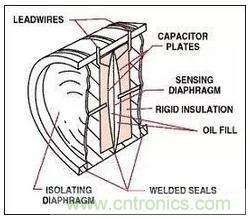 差動(dòng)電容式壓力傳感器的受壓膜片電極位于兩個(gè)固定電極之間,構(gòu)成兩個(gè)電容器。在壓力的作用下一個(gè)電容器的容量增大而另一個(gè)則相應(yīng)減小,測(cè)量結(jié)果由差動(dòng)式電路輸出。它的固定電極是在凹曲的玻璃表面上鍍金屬層而制成。過(guò)載時(shí)膜片受到凹面的保護(hù)而不致破裂。差動(dòng)電容式壓力傳感器比單電容式的靈敏度高、線性度好,但加工較困難(特別是難以保證對(duì)稱性),而且不能實(shí)現(xiàn)對(duì)被測(cè)氣體或液體的隔離,因此不宜于工作在有腐蝕性或雜質(zhì)的流體中。