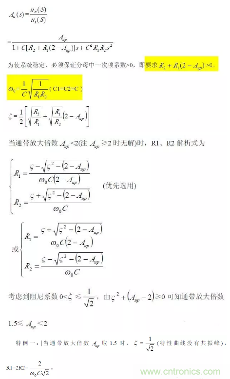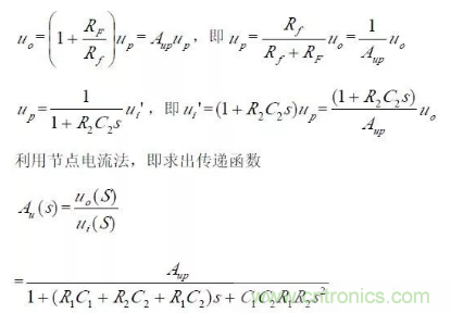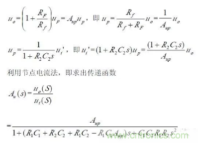 對于二階壓控低通濾波器來說,當通帶放大倍數(shù)Aup =1(單位增益)時,圖所示電路變?yōu)閳D所示,其中RF=R1+R2。