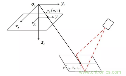 我們不考慮鏡頭的畸變,將相機(jī)的成像模型簡化為小孔成像模型,則特征點(diǎn)的圖像坐標(biāo)Pf 與其在攝像機(jī)坐標(biāo)系下的三維坐標(biāo)P 之間的關(guān)系可表示為: