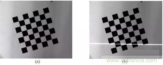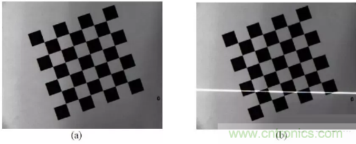 圖像的獲取是在攝機(jī)參數(shù)標(biāo)定過程中同時(shí)完成。 首先將棋盤格放在工作臺(tái)上, 在這個(gè)初始位置,利用攝像機(jī)采集一幅圖,如圖 (a) 所示 。保持?jǐn)z像機(jī)和棋盤格的位置姿態(tài)不變,打開激光器讓條紋投射到棋盤格上, 再采集一幅圖像如圖 (b) 所示:
