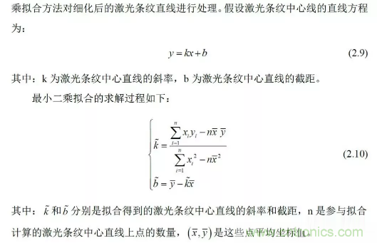 選取激光條紋中心線上的兩個(gè)點(diǎn)作為激光條紋的特征點(diǎn),為了提高激光條紋中心線的提取精度,利用最小二乘法擬合方法對(duì)細(xì)化后的激光條紋直線進(jìn)行處理。