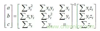 至此,得到四個(gè)激光條紋特征點(diǎn)的圖像坐標(biāo),由上式得四個(gè)激光條紋特征點(diǎn)在攝像機(jī)坐標(biāo)系下的坐標(biāo),由于三點(diǎn)確定一個(gè)平面方程,使用最小二乘法計(jì)算結(jié)構(gòu)光平面方程如下: