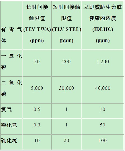 在美國,國家職業(yè)安全與健康研究所(NIOSH)和美國政府工業(yè)衛(wèi)生學(xué)家會議(ACGIH)已規(guī)定了許多有毒工業(yè)氣體的短時間和長時間接觸限值。"閾限值-時間加權(quán)平均值"(TLV-TWA)是指大多數(shù)工人可以在正常8小時工作日內(nèi)反復(fù)接觸而不會受到有害影響的時間加權(quán)平均濃度。"閾限值-短時間接觸限值"(TLV-STEL)是指大多數(shù)工人可以短時間接觸而不會受到刺激或傷害的濃度。"立即威脅生命或健康的濃度"(IDLHC)是一種限制性濃度,它會對生命立即或緩慢產(chǎn)生威脅,導(dǎo)致不可逆轉(zhuǎn)的健康損害,或者影響工人獨立逃生的能力。表1列出了幾種常見氣體的限值。
