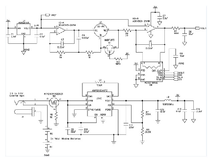 該電路由兩節(jié)AAA電池供電。使用二極管提供反向電壓保護(hù)會浪費寶貴的電能,因此本電路使用P溝道MOSFET (Q2)。該MOSFET通過阻塞反向電壓來保護(hù)電路,施加正電壓時導(dǎo)通。MOSFET的導(dǎo)通電阻小于100 mΩ,因此它引起的壓降遠(yuǎn)小于二極管。除AAA電池以外,降壓-升壓調(diào)節(jié)器ADP2503還允許使用最高5.5 V的外部電源。在省電模式下工作時,ADP2503的功耗僅38 μA.由L2、C12和C13構(gòu)成的濾波器可消除模擬電源軌產(chǎn)生的任何開關(guān)噪聲。連接外部電源時,該儀表不是通過一個電路來斷開電池,而是利用一個插孔以機械方式斷開電池,從而避免電能浪費。